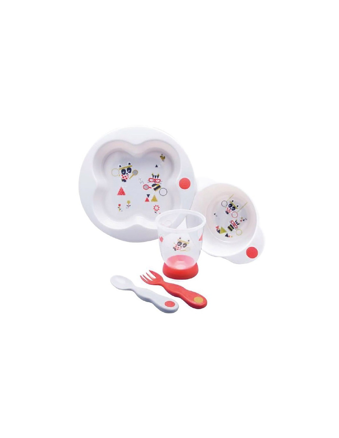 Set de repas qui comprend: une assiette, un bol, un verre, une fourchette et une cuillère d’apprentissage OffertsCompatible lave-vaisselle, congélateur et micro-ondes.Sans BPA